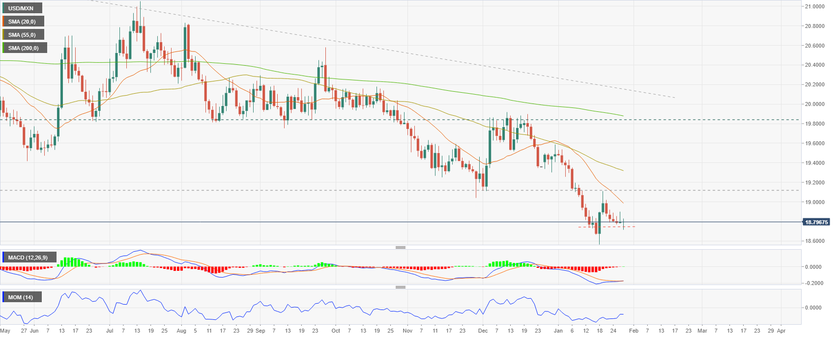 日图显示美元/墨西哥比索在18.80附近盘整。主要趋势是看跌,但如果墨西哥比索未能在短期内再创新高,美元可能会反弹。