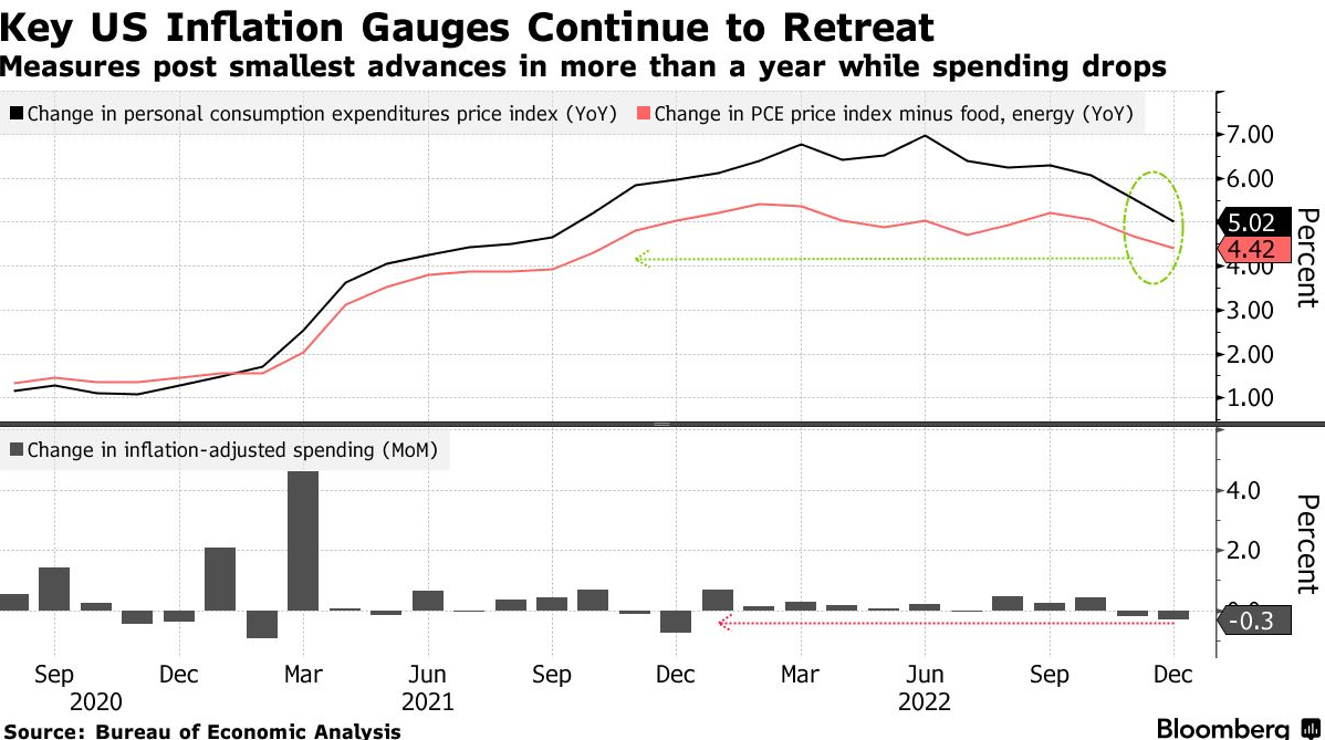 支持这一观点的一个事实是,随著通胀数据下降,市场对美联储更加鸽派的预期一直在增长。作為美联储首选的通胀指标,个人消费支出核心价格指数年率4.4%,增速為2021年底以来最缓增速。整体价格上升至5%,低于期值5.1%,月率指标上升0.1%。