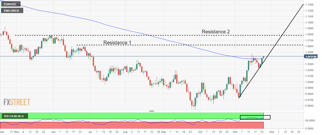 如果欧元/美元突破11月高点1.0482,那麽欧元/美元将测试6月27日高点1.0615,然后是5月30日高点1.0787。