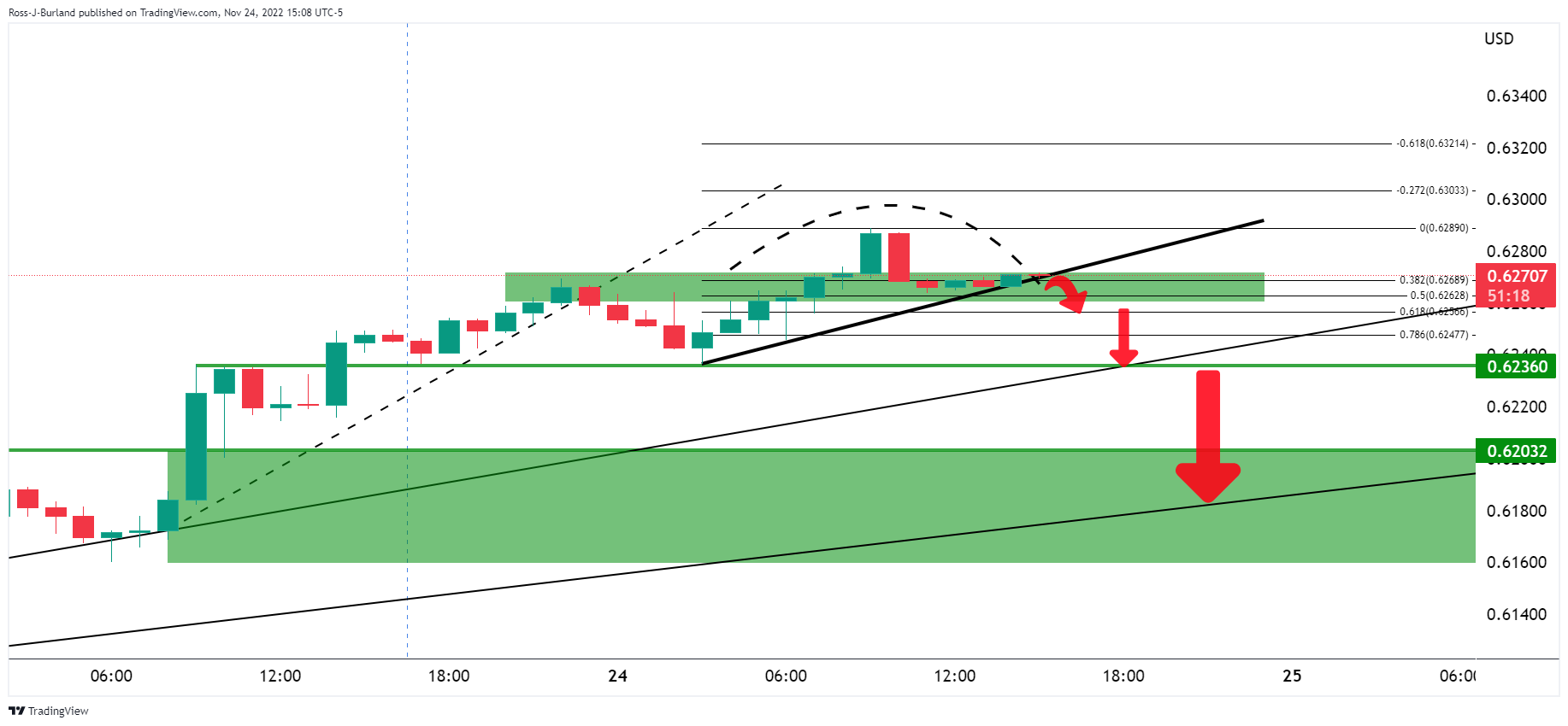 纽元/美元现在正在测试下一个趋势缐支撑,若纽元/美元跌破该水平,可能会下行测试0.6250下方,并指向前期低位0.6236,然后是趋势缐0.6200。