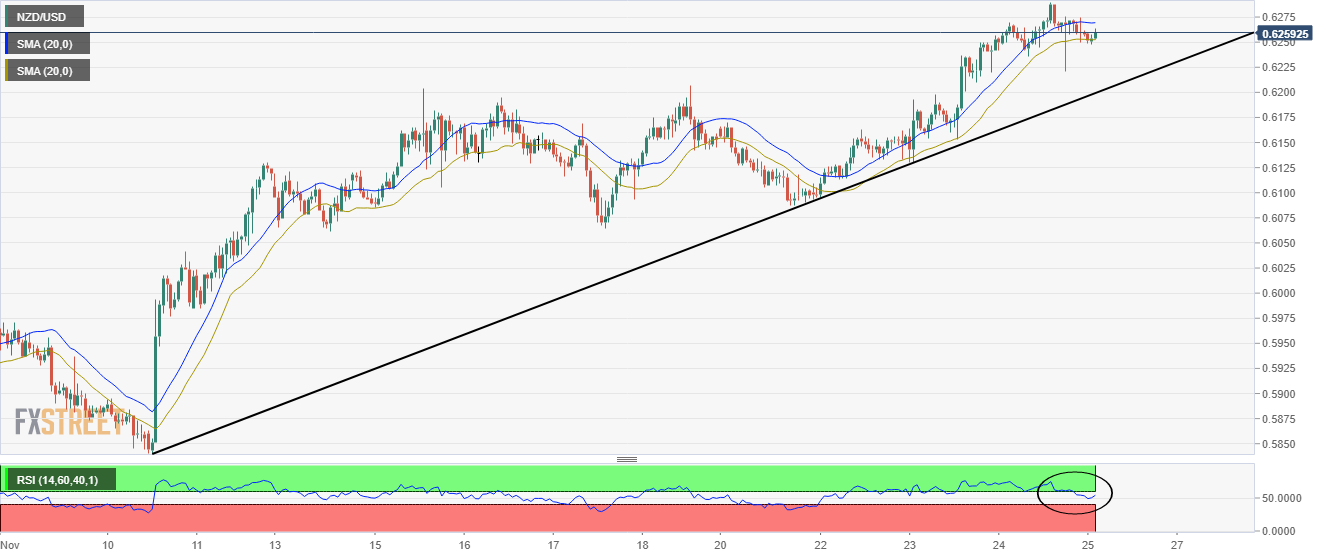 在一小时图上,该资产有望在20小时MA均缐(高-低)0.6252-0.6270获得支撑。自11月10日低点0.5841以来的上行趋势缐将充当重要支撑位。
