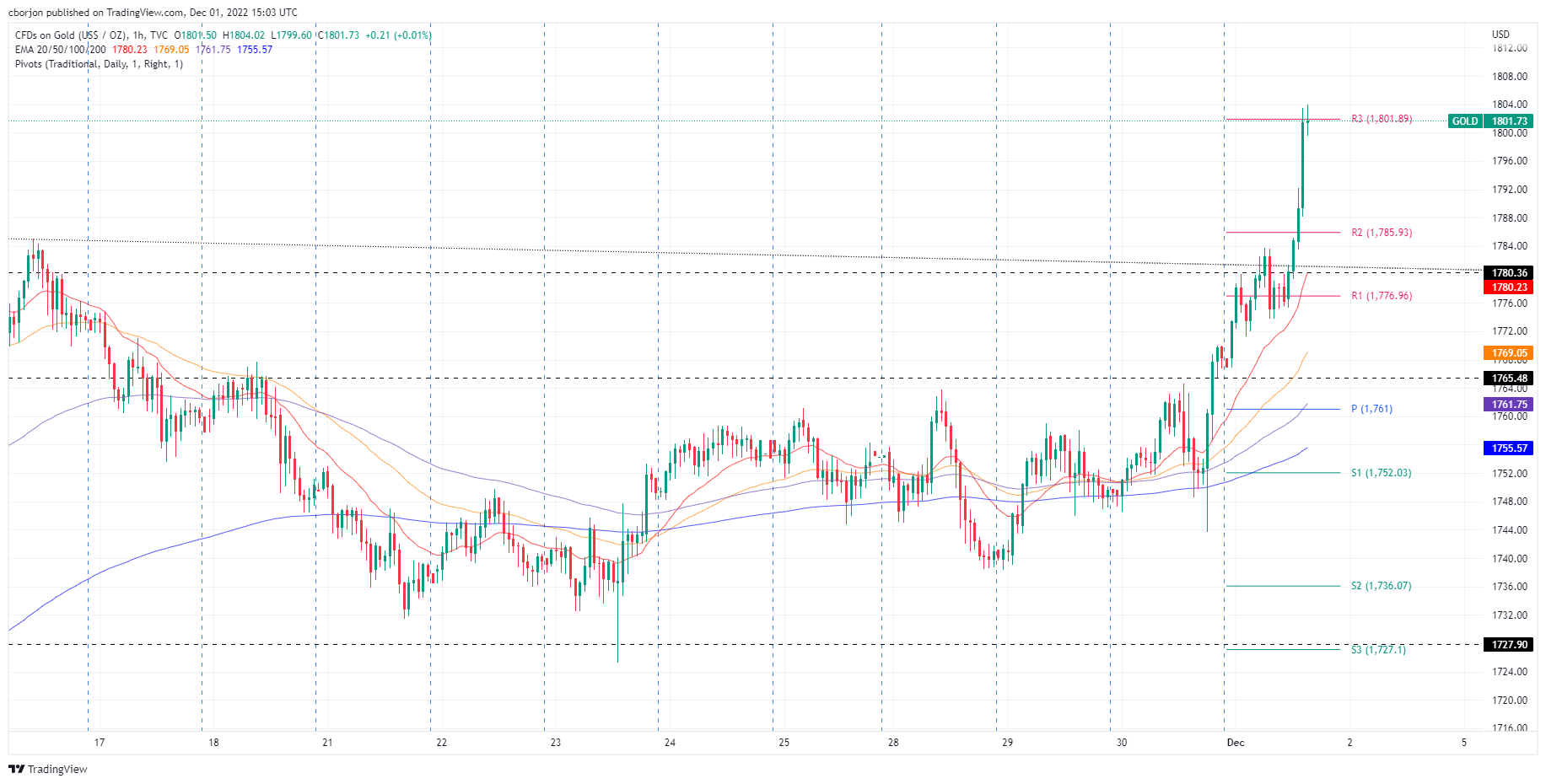 在杰洛米·鲍威尔周三发表鸽派言论后,黄金兑美元在触及每日低点1767美元(周三的高点)后走高,并向1803.40美元逼近。鲍威尔表示,“最快可能在12月的会议上就会放缓加息步伐”,这巩固了美联储将从过去四次会议上的每次加息75个基点降至加息50个基点的预期。在演讲后的问答环节中,他表示,“我的同事和我都不希望过度紧缩”,指的是货币政策。