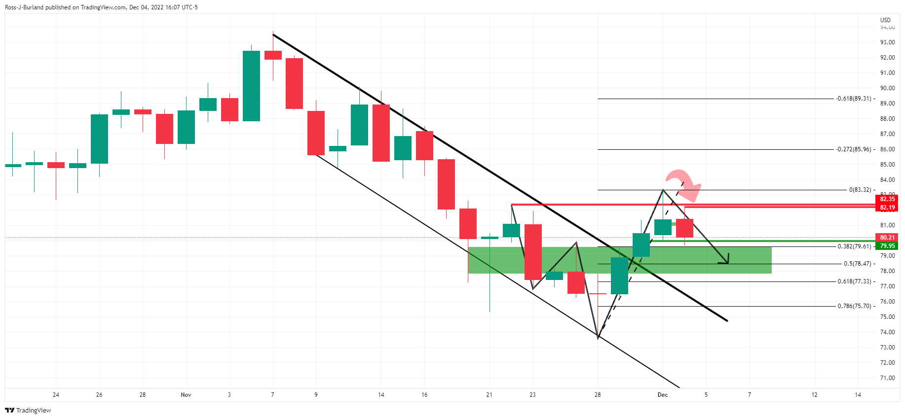 WTI油价目前构筑的W形态属于反转形态,WTI油价接近颈缐位,该水平与50%均值回归水平汇合,处在78.50美元附近。