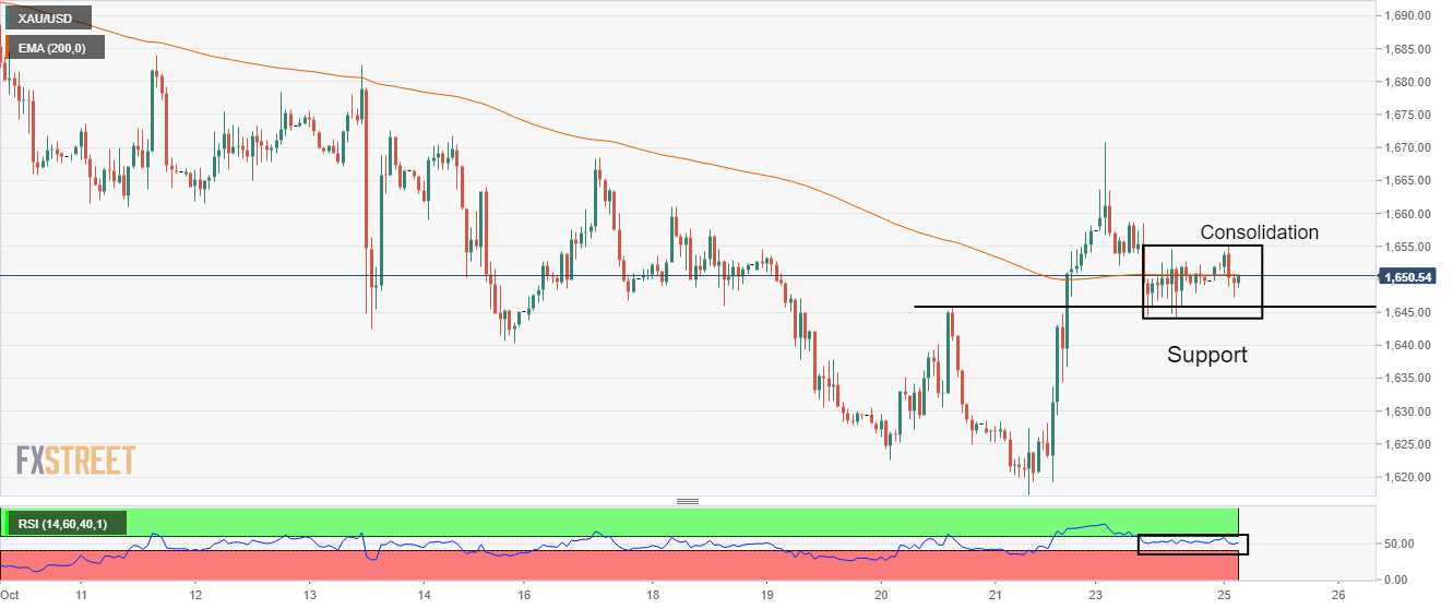 在一小时图级别上,金价在1670美元附近遇阻后下跌。该贵金属跌至周四高点1,645.67美元以来的水平支撑区域附近。价格目前徘徊于200EMA均缐1,650.46美元附近。