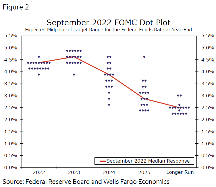 我们对联邦基金利率的最新预测也反映了美联储“不惜一切代价”遏制通胀的明显意?。正如美联储主席鲍威尔8月26日在杰克逊霍尔的讲话中所表达的那样,“联邦公?市场委员会目前的首要重点是将通货膨胀率降至2%的目标。 ”这一承诺在委员会9月21日政策会议结束时发布的“点状图”中得到了明显表达。绝大多数FOMC成员认為年底联邦基金利率的目标区间為4.00%-4.25%或4.25%-4.50%(图2)。简而言之,绝大多数政策制定者预计在2022年最后两次政策会议上加息100个基点或125个基点。此外,大多数委员会成员预计2023年将进一步收紧政策。我们之前的预测似乎与联邦公?市场委员会(FOMC)最近的想法和遏制通胀的决心不符。