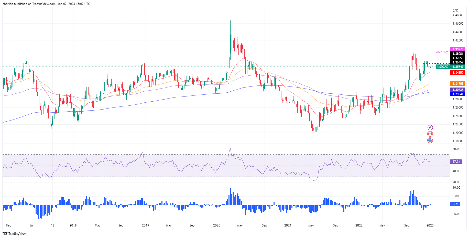 在北美市场2023年的第一个交易日,美元/加元反弹至50日指数移动均缐(EMA) 1.3532附近,并向20日移动均缐上涨,因為大多数市场在新年前夕仍处于休市状态,流动性较弱。在输入本文时,美元/加元在触及低点1.3535后交易于1.3573。