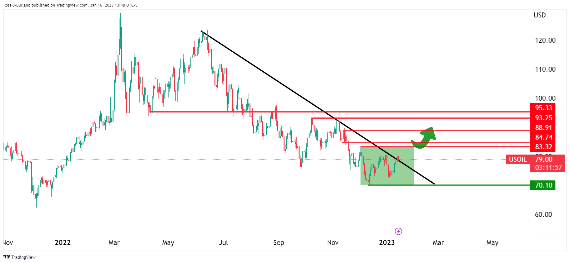 另外,若WTI油价突破这一形态,将上涨接近93.25 / 95.33,然后进一步上涨,整理于2022年夏季以来的看跌周期内: