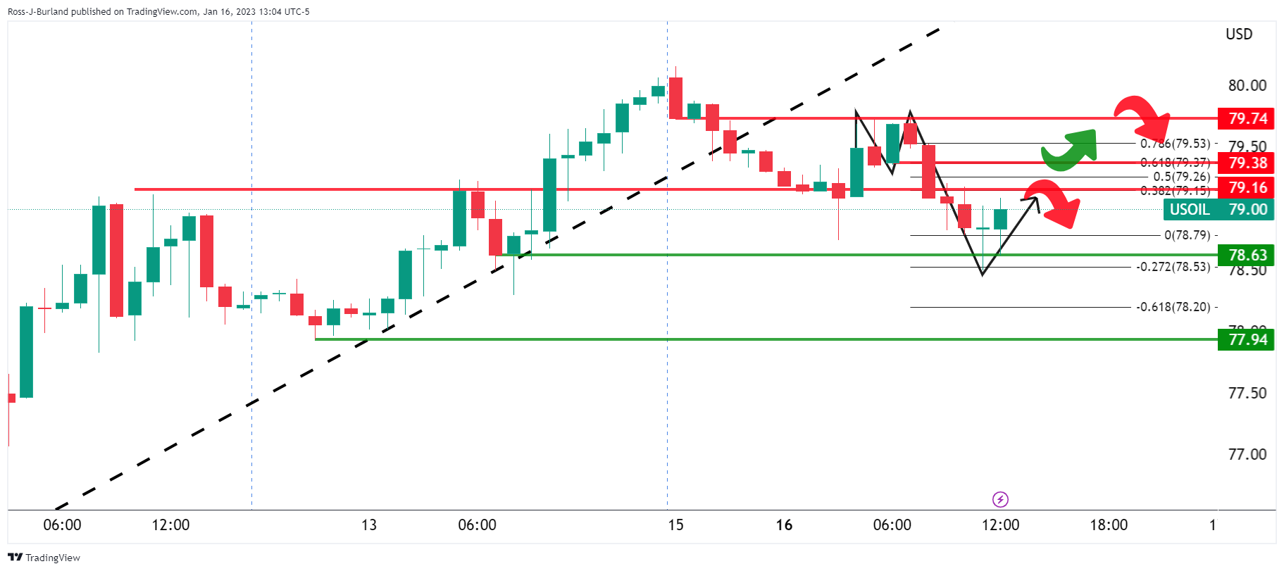 从技术面来看,小时图WTI油价构筑M形态,这属于倒转形态,预期WTI油价将接近前期看跌趋势的斐波位。 38.2%斐波位处在79.15附近,该水平构成阻力,WTI油价有望重测该水平。