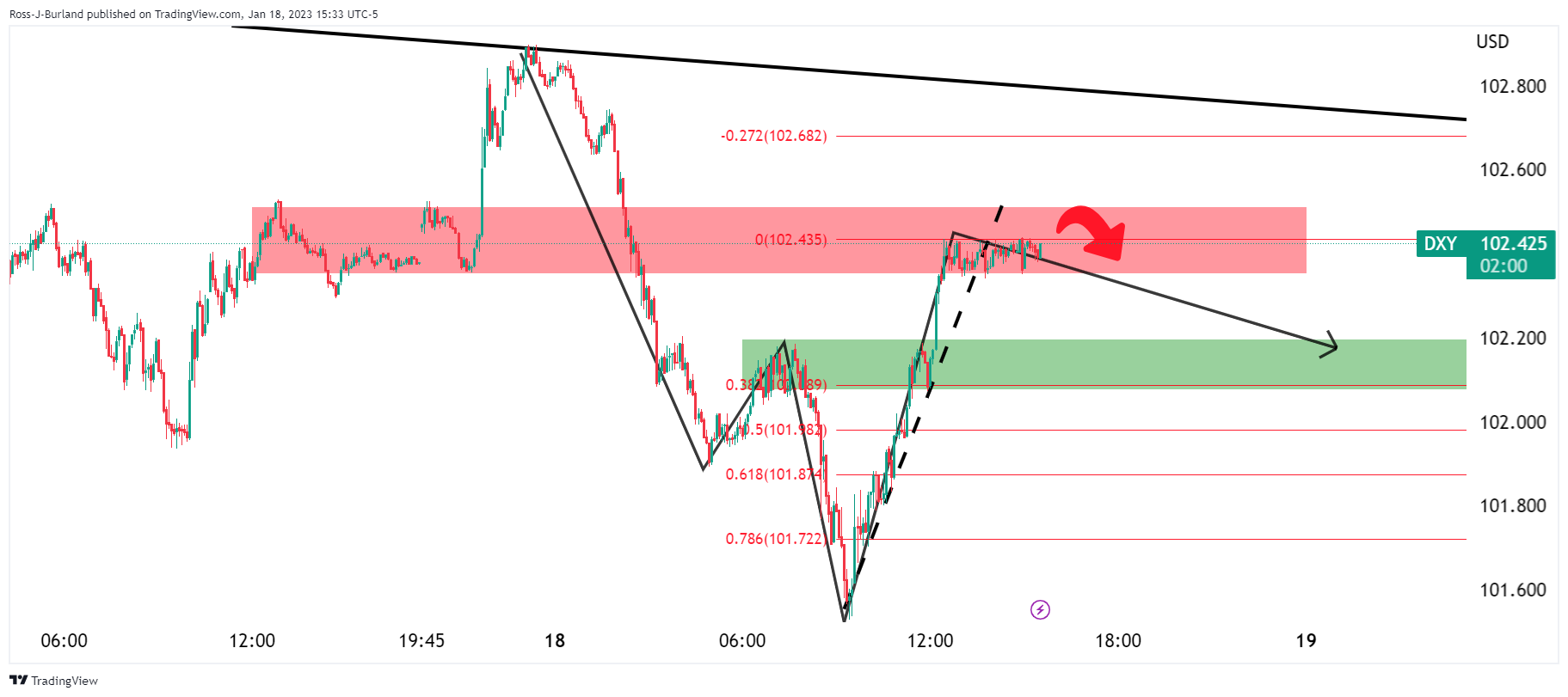 然而,正如上图所示,美联储官员詹姆斯·布拉德(James Bullard)等人发表鹰派讲话提振美股交易情绪后,多头转向美元。然而,美元指数构筑W形态,可能会打压美元,美元料将重测102.20水平。